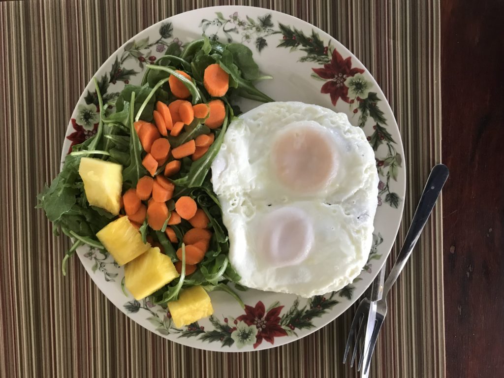 This picture is a great example of what eating REAL FOOD looks like. An attractive array of colors with a fresh salad of arugula, raw carrots, and a splash of pineapple. A light homemade vinaigrette salad dressing makes this meal simple yet satisfying. You will not be hungry for hours….